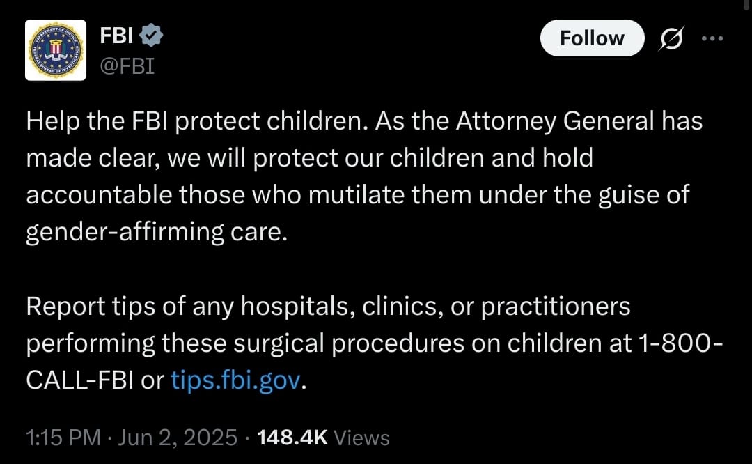 Today, the FBI tweeted a call for the public to report hospitals or clinics performing gender-affirming surgeries on minors. Framing these treatments as "mutilation," the Bureau directed tips to 1-800-CALL-FBI tipline, launching an unprecedented intrusion of federal law enforcement into personal medical decisions. Coming during Pride Month, this tweet marked a federal escalation against trans healthcare and struck many as authoritarian, drawing on past tactics where governments encouraged citizens to inform on one another.